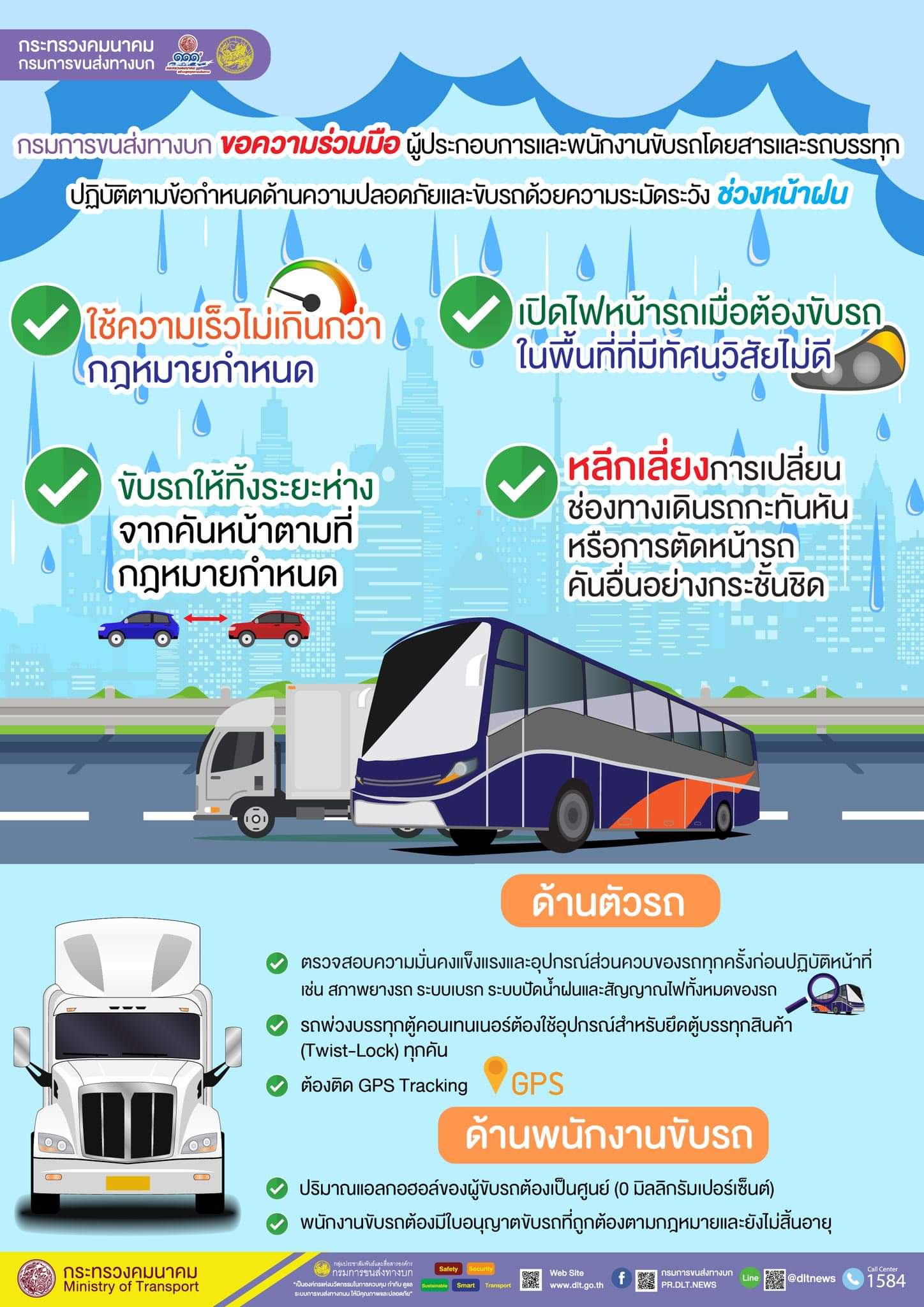 กรมการขนส่งทางบกในฐานะหน่วยงานที่กำกับดูแลการปฏิบัติหน้าที่ของผู้ขับรถโดยสารและรถบรรทุกในการขนส่งให้มีความปลอดภัย ขอความร่วมมือให้ผู้ประกอบการกวดขันและกำชับพนักงานขับรถโดยสารและรถบรรทุกปฏิบัติตามข้อกำหนดด้านความปลอดภัยและขับรถด้วยความระมัดระวังช่วงหน้าฝน และควรปฏิบัติตามกฎจราจรอย่างเคร่งครัด เช่น