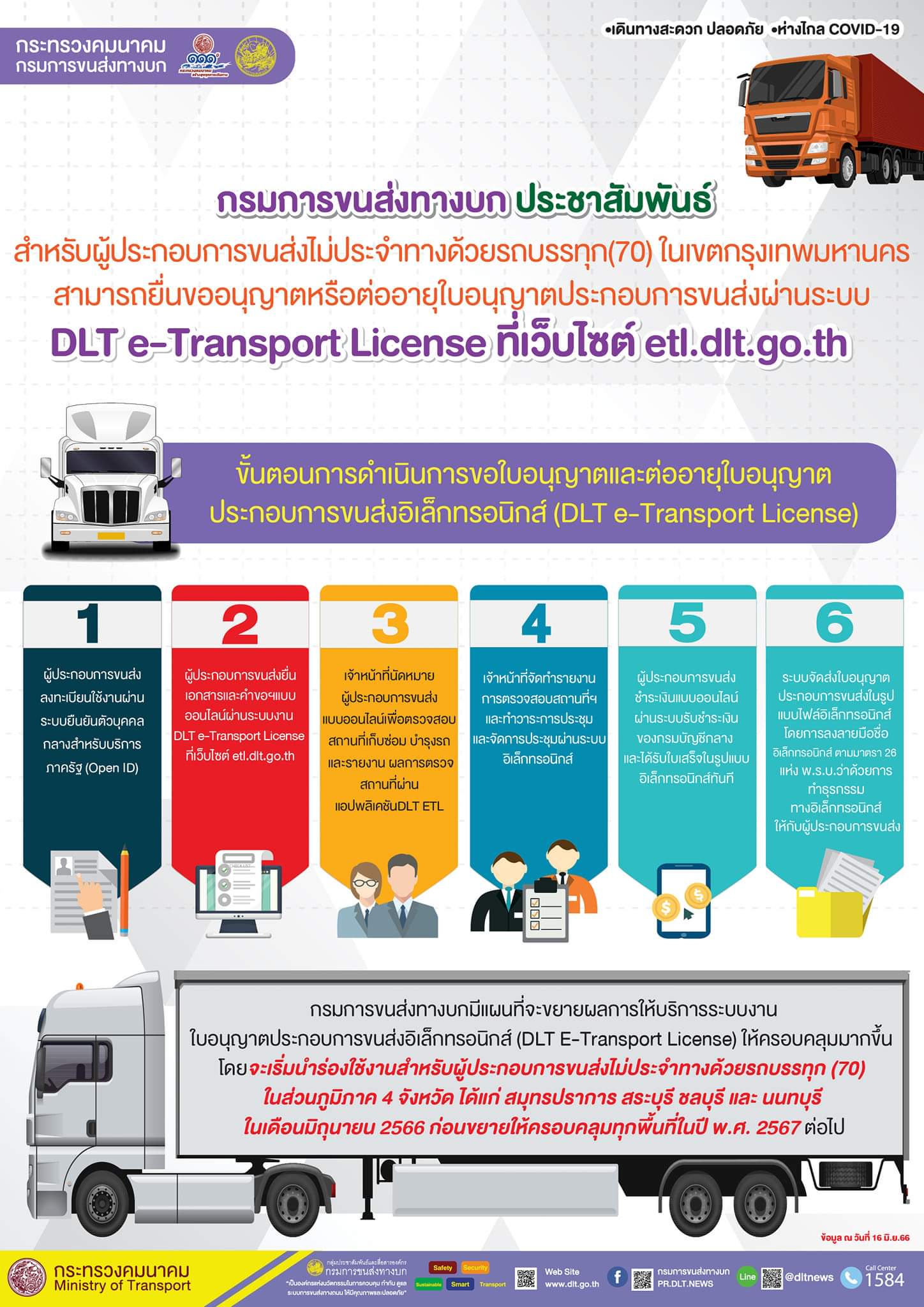 นางสิริรัตน์ วีรวิศาล รองอธิบดีกรมการขนส่งทางบก กล่าวว่า กรมการขนส่งทางบกประชาสัมพันธ์สำหรับผู้ประกอบการขนส่งไม่ประจำทางด้วยรถบรรทุก (70) ในเขตกรุงเทพมหานคร สามารถยื่นดำเนินการขออนุญาตหรือต่ออายุใบอนุญาตประกอบการขนส่งไม่ประจำทาง รวมถึงการขอเพิ่มรถบรรจุรถ ถอนรถ ฯลฯ ในรูปแบบออนไลน์ผ่านระบบงานใบอนุญาตประกอบการขนส่งอิเล็กทรอนิกส์(DLT E-Transport License) ได้ที่เว็บไซต์ etl.dlt.go.th โดยเริ่มตั้งแต่การยื่นคำขอและส่งเอกสารหลักฐานแบบออนไลน์ การชำระเงินค่าธรรมเนียม ผ่านระบบ E-Payment ของกรมบัญชีกลาง และได้รับใบเสร็จรับเงิน และใบอนุญาตประกอบการขนส่งในรูปแบบไฟล์อิเล็กทรอนิกส์