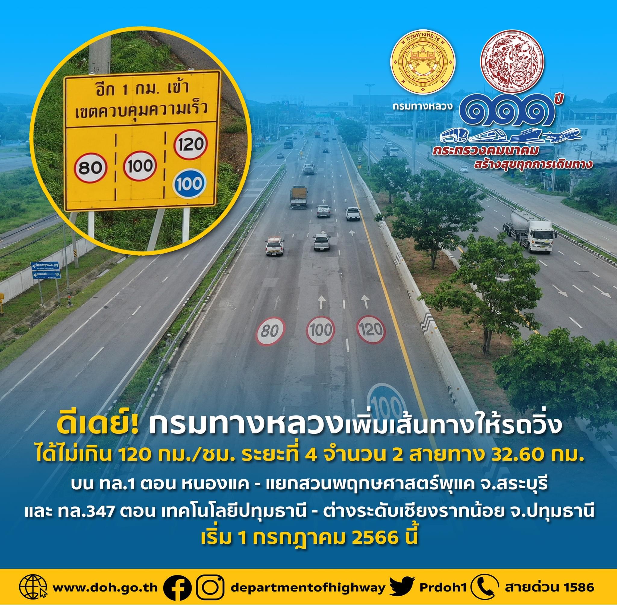 นายสราวุธ ทรงศิวิไล อธิบดีกรมทางหลวง กระทรวงคมนาคม เผยว่า กรมทางหลวง (ทล.) พร้อมอำนวยความสะดวก รวดเร็ว และปลอดภัยให้กับประชาชนในการเดินทางตามนโยบายกระทรวงคมนาคม เรื่องการปฏิบัติตามกฎกระทรวงกำหนดอัตราความเร็วยานพาหนะบนทางหลวงแผ่นดินหรือทางหลวงชนบทที่กำหนด พ.ศ. 2564 โดยเพิ่มเส้นทางให้สามารถใช้ความเร็วจำกัดไม่เกิน 120 กิโลเมตร/ชั่วโมง และไม่ต่ำกว่า 100 กิโลเมตร/ชั่วโมง ในช่องขวาสุด 2 เส้นทาง ทั้งขาเข้าและขาออก รวมระยะทาง 32.60 กิโลเมตร เป็นการดำเนินการตามนโยบายในระยะที่ 4 โดยมีผลบังคับใช้ตั้งแต่วันที่ 1 กรกฎาคม 2566 เป็นต้นไป ตามประกาศผู้อำนวยการทางหลวงแผ่นดิน ดังนี้