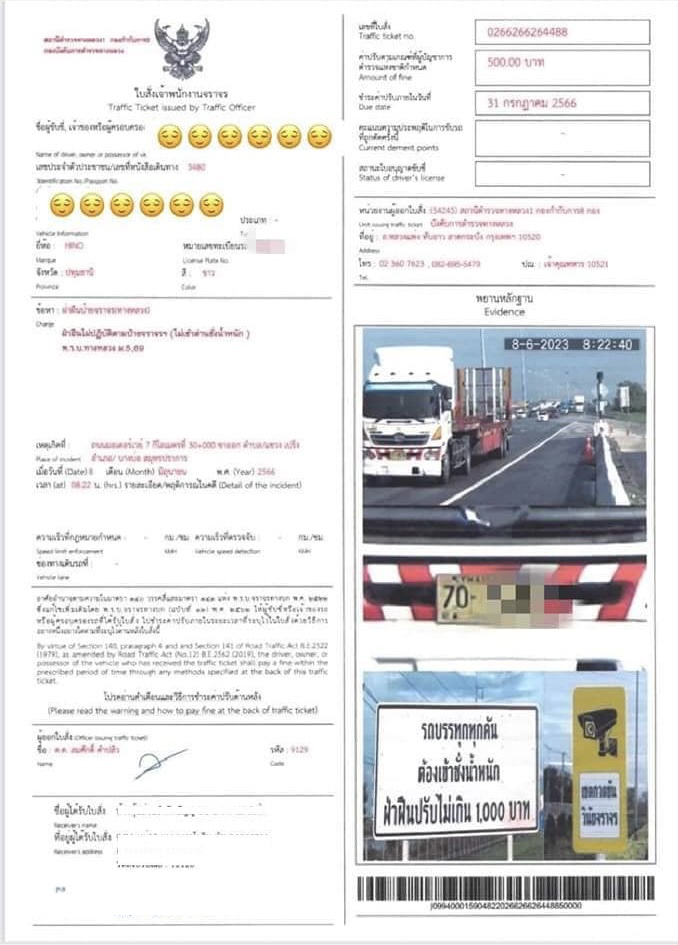 คนขับรถบรรทุกรายหนึ่งโดนแล้วใบสั่งเจ้าพนักงานจราจร! รถบรรทุกเปล่า ข้อหาฝ่าฝืนป้ายจราจรสถานี เหตุเกิดที่ ถนนมอเตอร์เวย์ 7 ขาออก บางบ่อ จ.สมุทรปราการ ไม่ปฏิบัติตามคำสั่งป้ายจราจรว่า “รถบรรทุกทุกคัน ต้องเข้าด่านชั่งน้ำหนัก ฝ่าฝืนปรับไม่เกิน 1,000 บาท” โดนใบสั่งส่งมาถึงบ้านต้องชำระค่าปรับ 500 บาท เน้นย้ำรถบรรทุกทุกคันมีหน้าที่ปฏิบัติตามป้ายบังคับ และตามกฎหมายทุกคัน ไม่มีข้อยกเว้น ซึ่งใช้อำนาจในการออกใบสั่งตาม พรบ.จราจร มาตรา 140 และพรบ.ทางหลวง มาตรา 5 (2) ประกอบกำหนดโทษมาตรา 69 กฎกระทรวง กําหนดการจัดทําปักติดตั้งป้ายจราจรเครื่องหมายจราจรหรือสัญญาณจราจร สําหรับการจราจรบนทางหลวงพ.ศ. 2563 ขอเตือนคนขับรถบรรทุกทุกท่าน