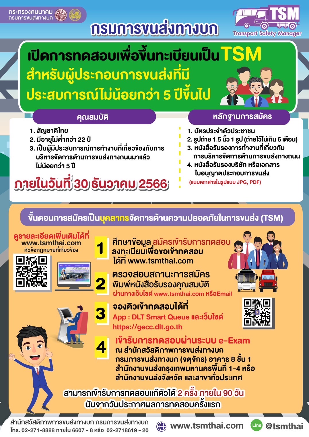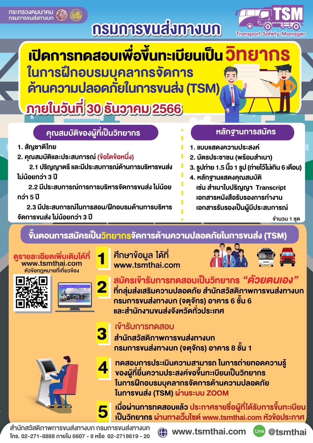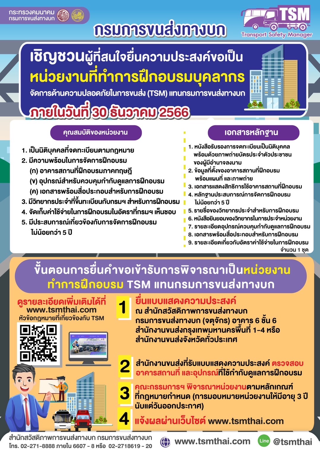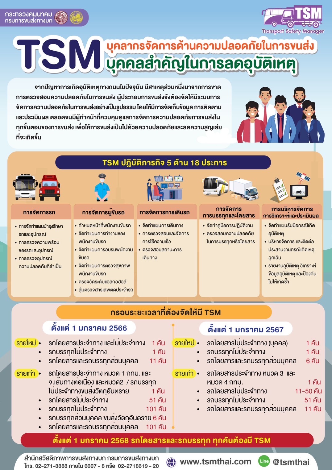 กรมการขนส่งทางบก (ขบ.) ได้ออกประกาศ เรื่อง กำหนดคุณสมบัติ หลักสูตรระยะเวลาการฝึกอบรม และ หน้าที่ของบุคลากรจัดการด้านความปลอดภัยในการขนส่ง (Transport Safety Manager : TSM) พ.ศ. 2564 และได้ลงประกาศในราชกิจจานุเบกษา เมื่อวันที่ 27 มกราคม 2565 และปัจจุบันมีผลใช้บังคับแล้วซึ่งประกาศดังกล่าวจะใช้บังคับกับ ผู้ประกอบการขนส่งประจำทางและไม่ประจำทางด้วยรถโดยสาร ผู้ประกอบการขนส่งไม่ประจำทางด้วยรถบรรทุก และผู้ประกอบการขนส่งส่วนบุคคลทุกราย โดยจะต้องจัดให้มีบุคลากรจัดการด้านความปลอดภัยในการขนส่ง (Transport Safety Manager : TSM) ซึ่งมีหน้าที่หลัก 5 ด้าน ได้แก่
