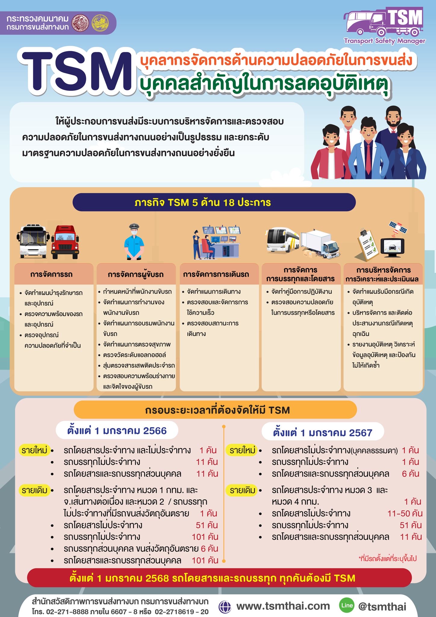 นางสิริรัตน์ วีรวิศาล รองอธิบดีกรมการขนส่งทางบก เผยว่า ตามที่กรมการขนส่งทางบกได้ ออกประกาศ เมื่อวันที่ 23 พฤศจิกายน 2564 เรื่อง กำหนดคุณสมบัติ หลักสูตร ระยะเวลาการฝึกอบรมและหน้าที่ของบุคลากรจัดการด้านความปลอดภัยในการขนส่ง พ.ศ. 2564 กำหนดให้ผู้ประกอบการขนส่งด้วยรถโดยสารและรถบรรทุกในประเทศไทย จะต้องจัดให้มีบุคลากรจัดการด้านความปลอดภัยในการขนส่ง (TSM) ซึ่งมีหน้าที่หลัก 5 ด้าน ได้แก่ การจัดการรถ การจัดการผู้ขับรถ การจัดการการเดินรถ การจัดการการบรรทุกและการโดยสาร และการบริหารจัดการ การวิเคราะห์และประเมินผล เพื่อให้ การขนส่งทางถนนมีความปลอดภัย และลดความสูญเสียที่จะเกิดขึ้นจากการขนส่งทางถนน โดยต้องผ่านการฝึกอบรมตามหลักสูตรบุคลากรจัดการด้านความปลอดภัยในการขนส่ง (TSM) ของกรมการขนส่งทางบก (บุคคลทั่วไปอบรม 18 ชม. เจ้าหน้าที่ความปลอดภัยในการทำงานระดับวิชาชีพ อบรม 6 ชม. และผู้มีประสบการณ์การบริหารจัดการด้านการขนส่งทางถนน ไม่น้อยกว่า 5 ปี อบรม 6 ชม.) และผ่านการทดสอบในระบบ e-Exam