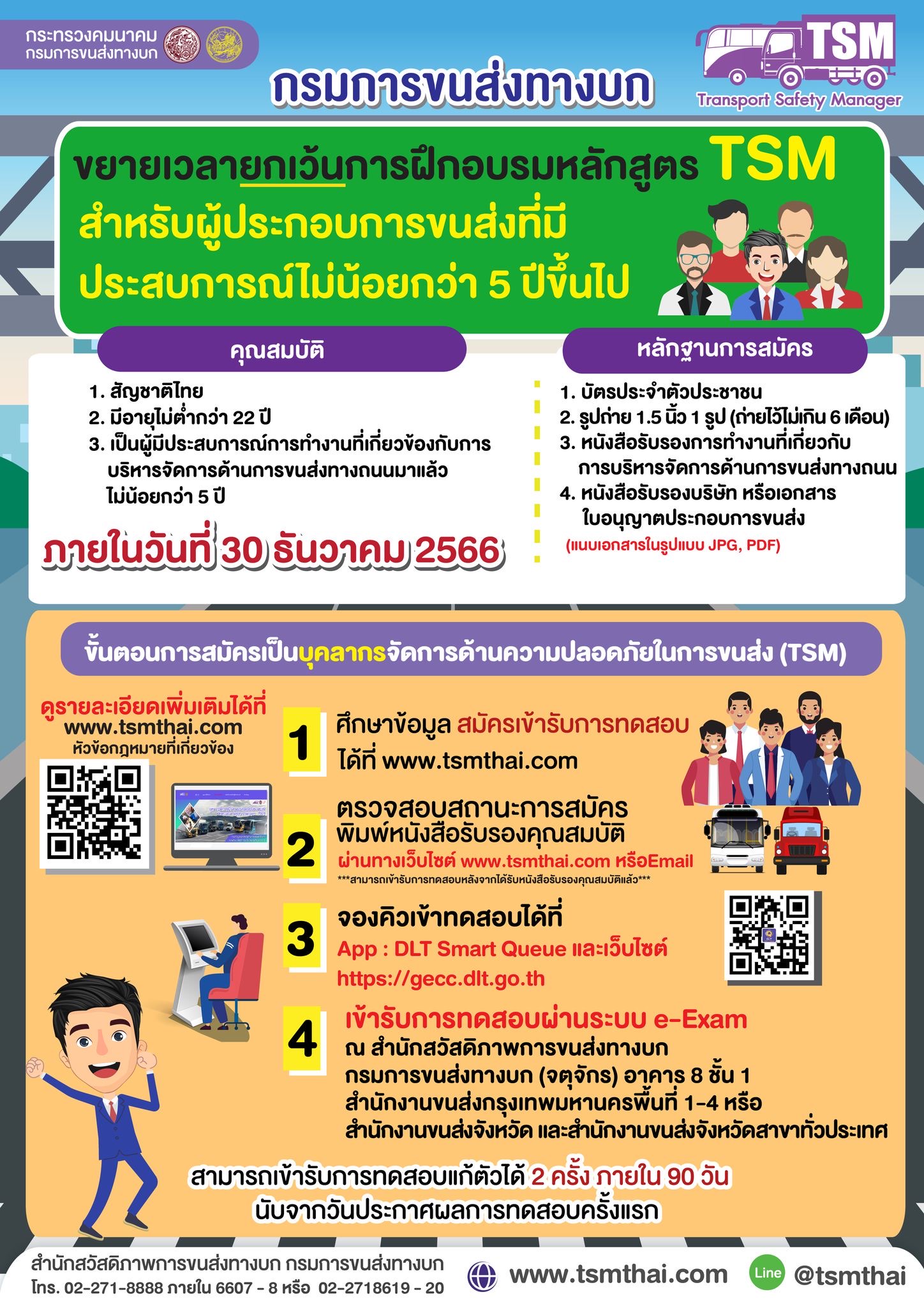 ทั้งนี้ หากสอบไม่ผ่าน สามารถสอบแก้ตัวได้อีก 2 ครั้ง ภายใน 90 วัน นับแต่วันที่สอบไม่ผ่านครั้งแรก รองอธิบดีกรมการขนส่งทางบก กล่าวเพิ่มเติมว่า ผู้ประกอบการขนส่งต้องเร่งดำเนินการจัดให้มีบุคลากรจัดการด้านความปลอดภัยในการขนส่ง (TSM) ตามกรอบระยะเวลาที่กรมการขนส่งทางบกกำหนด ซึ่งกำหนดให้มีผลบังคับใช้ ตั้งแต่ 1 มกราคม 2566 ในกลุ่มผู้ขอรับใบอนุญาตประกอบการขนส่ง (รายใหม่) ได้แก่ รถโดยสารประจำทาง และไม่ประจำทาง (ผู้ขอเป็นนิติบุคคล) ที่มีรถตั้งแต่ 1 คันขึ้นไป รถบรรทุกไม่ประจำทาง และรถโดยสารส่วนบุคคลที่มีรถตั้งแต่ 11 คันขึ้นไปและในกลุ่มผู้ได้รับใบอนุญาตประกอบการขนส่ง (รายเดิม) ได้แก่ รถโดยสารประจำทาง หมวด 1 กทม. และจังหวัดที่มีเส้นทางต่อเนื่อง และหมวด 2 ที่มีรถตั้งแต่ 1 คันขึ้นไป รถโดยสารไม่ประจำทางที่มีรถตั้งแต่ 51 คันขึ้นไป รถบรรทุกไม่ประจำทาง (ที่มีรถขนส่งวัตถุอันตราย) ที่มีรถตั้งแต่ 1 คันขึ้นไปรถบรรทุกไม่ประจำทางที่มีรถตั้งแต่ 101 คันขึ้นไป รถบรรทุกส่วนบุคคล (ที่มีรถขนส่งวัตถุอันตราย) ที่มีรถตั้งแต่ 6 คันขึ้นไป และรถโดยสารและรถบรรทุกส่วนบุคคลที่มีรถตั้งแต่ 101 คันขึ้นไป