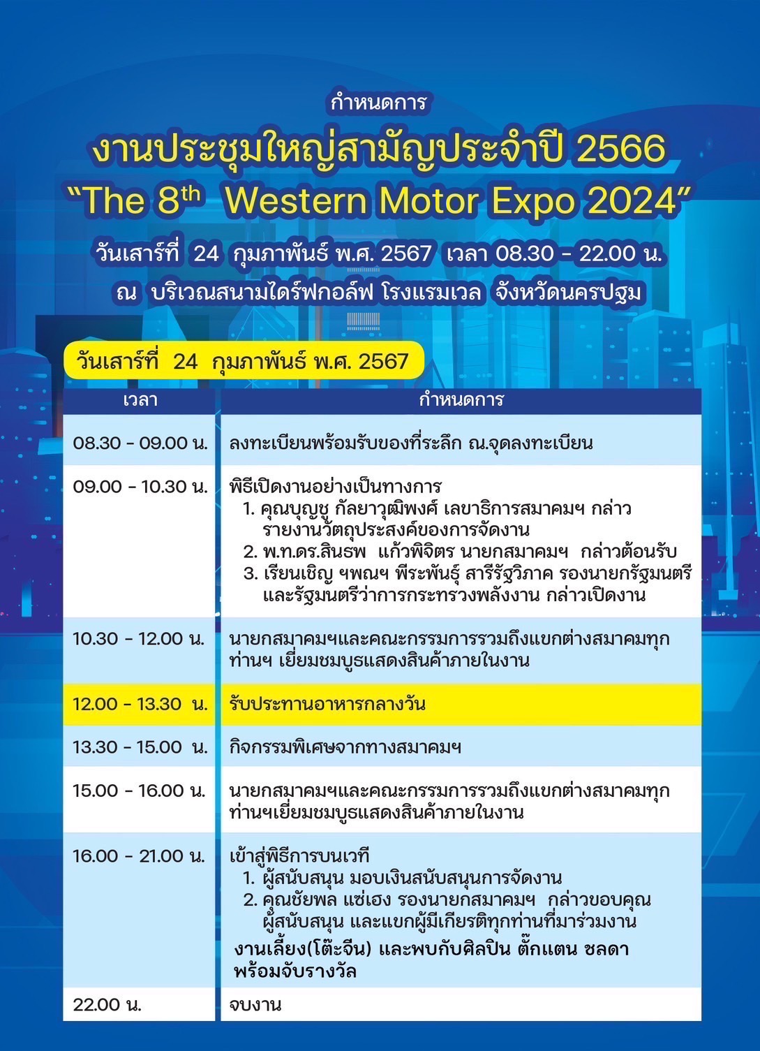 สมาคมรถบรรทุกภาคตะวันตกได้จัดงานประชุมใหญ่สามัญประจำปี 2566 โดยใช้ชื่องาน “ The 8th Western Motor Expo 2024 [" มอเตอร์เอ็กซโปร ครั้งที่ 8 " สมาคมรถบรรทุกภาคตะวันตก] “ ที่จัดขึ้นในวันเสาร์ที่ 24 กุมภาพันธ์ 2566 ณ บริเวณสนามไดร์ฟกอล์ฟ โรงแรมเวล จ.นครปฐม ตั้งแต่เวลา 08:00 น. - 22:00 น. ในงานท่านจะได้พบ มหกรรมยานยนต์รถบรรทุกและงานแสดงสินค้าและกิจกรรมมากมาย สินค้าราคาพิเศษ อะไหล่ อุปกรณ์ รถบรรทุก และส่วนลดแรงสุดแห่งปี และมีศิลปิน ตั๊กแตน ชลดา ที่จะมามอบเสียงเพลงในงานเลี้ยงยามค่ำคืนพร้อมกับจับรางวัลแจกมากมายให้กับสมาชิก อย่าลืมมาร่วมงานกันนะ
