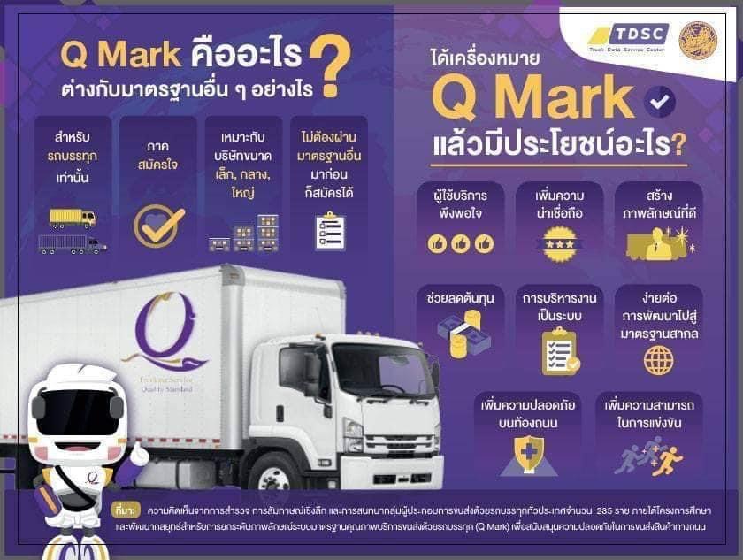 "มาตรฐาน Q Mark เป็นเครื่องมือสำคัญในการพัฒนาและส่งเสริมการขนส่งสินค้าให้มีคุณภาพ สร้างความเชื่อมั่นให้แก่ผู้ใช้บริการ เพิ่มโอกาสทางด้านธุรกิจ"