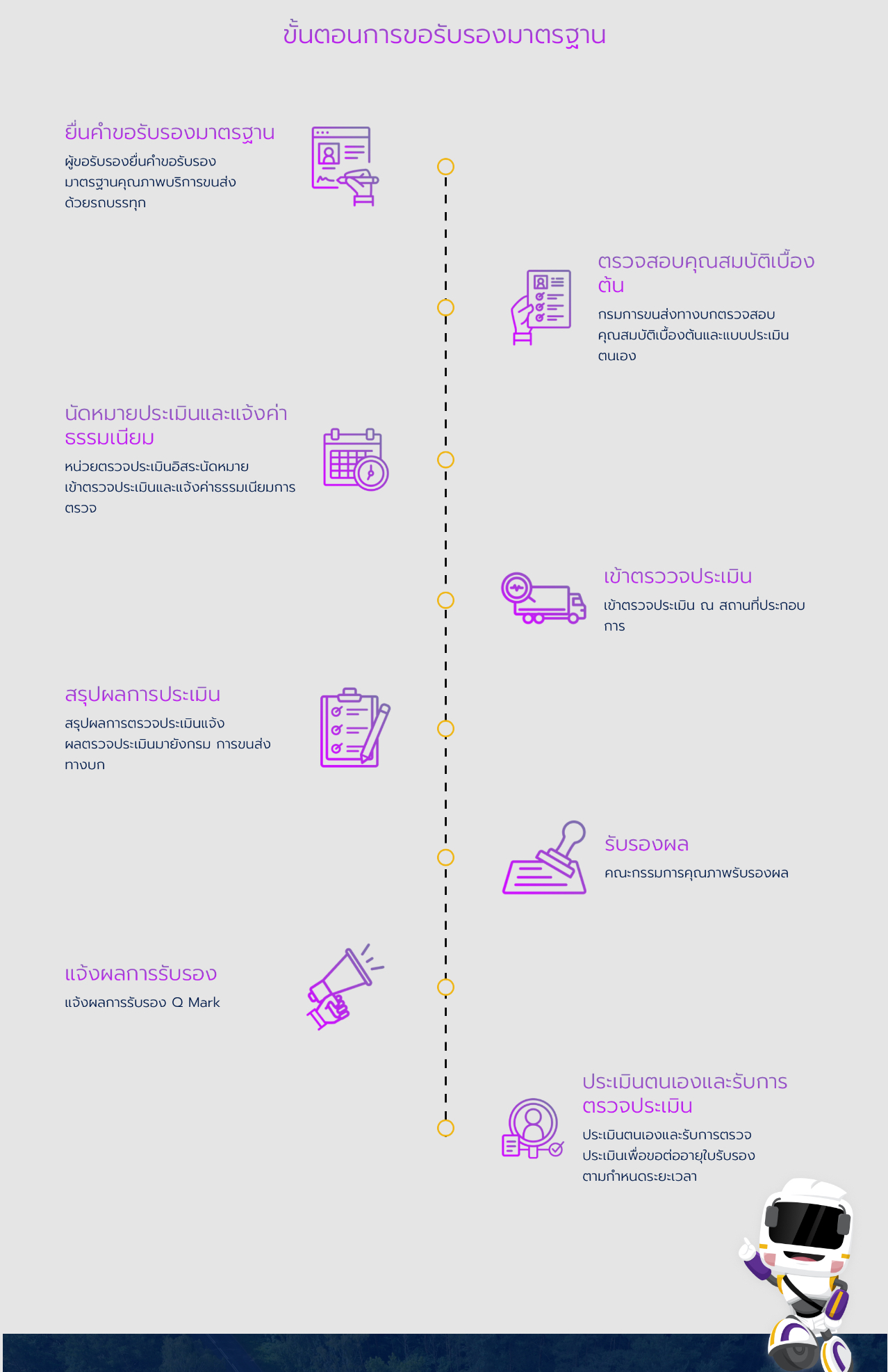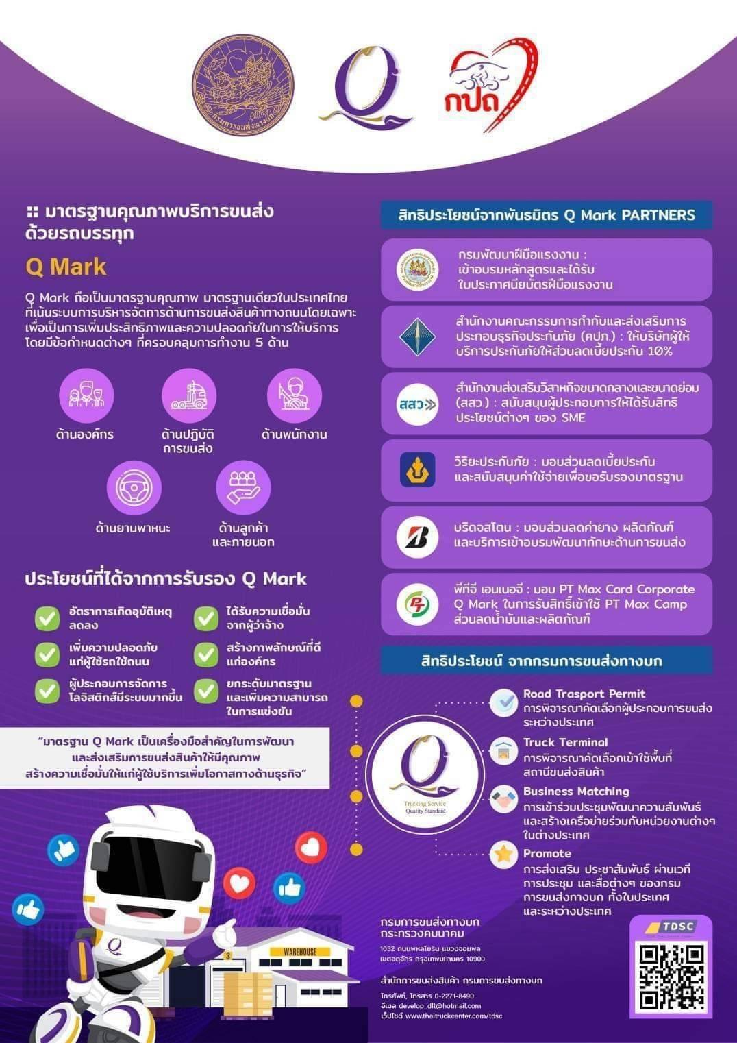 สิทธิประโยชน์ จากกรมการขนส่งทางบก1.Road Trasport Permit การพิจารณาคัดเลือกผู้ประกอบการขนส่งระหว่างประเทศ2. Truck Terminal การพิจารณาคัดเลือกเข้าใช้พื้นที่สถานีขนส่งสินค้า 3. Business Matching การเข้าร่วมประชุมพัฒนาความสัมพันธ์และสร้างเครือข่ายร่วมกับหน่วยงานต่างๆในต่างประเทศ4. Promote การส่งเสริม ประชาสัมพันธ์ ผ่านเวทีการประชุม และสื่อต่างๆ ของกรมการขนส่งทางบก ทั้งใประเทศ สิทธิประโยชน์จากพันธมิตร Q Mark Partners1.กรมพัฒนาฝีมือแรงงาน : เข้าอบรมหลักสูตรและได้รับใบประกาศนียบัตรฝีมือแรงงาน2.สำนักงานคณะกรรมการกำกับและส่งเสริมการประกอบธุรกิจประกันภัย (คปภ.) : ให้บริษัทผู้ให้บริการประกันภัยให้ส่วนลดเบี้ยประกัน 10%3. สำนักงานส่งเสริมวิสาหกิจขนาดกลางและขนาดย่อม(สสว ) : สนับสนุนผู้ประกอบการให้ได้รับสิทธิประโยชน์ต่างๆ ของ SME4. วิริยะประกันภัย : มอบส่วนลดเบี้ยประกันและสนับสนุนค่าใช้จ่ายเพื่อขอรับรองมาตรฐาน5. บริดจสโตน : มอบส่วนลดค่ายาง ผลิตภัณฑ์และบริการเข้าอบรมพัฒนาทักษะด้านการขนส่ง6. พีทีอี เอนเนอจี : มอบ PT Max Card Corporate Q Mark ในการรับสิทธิ์เข้าใช้ PT Max Camp ส่วนลดน้ำมันและผลิตภัณฑ์ คู่มือการสมัครQMark :