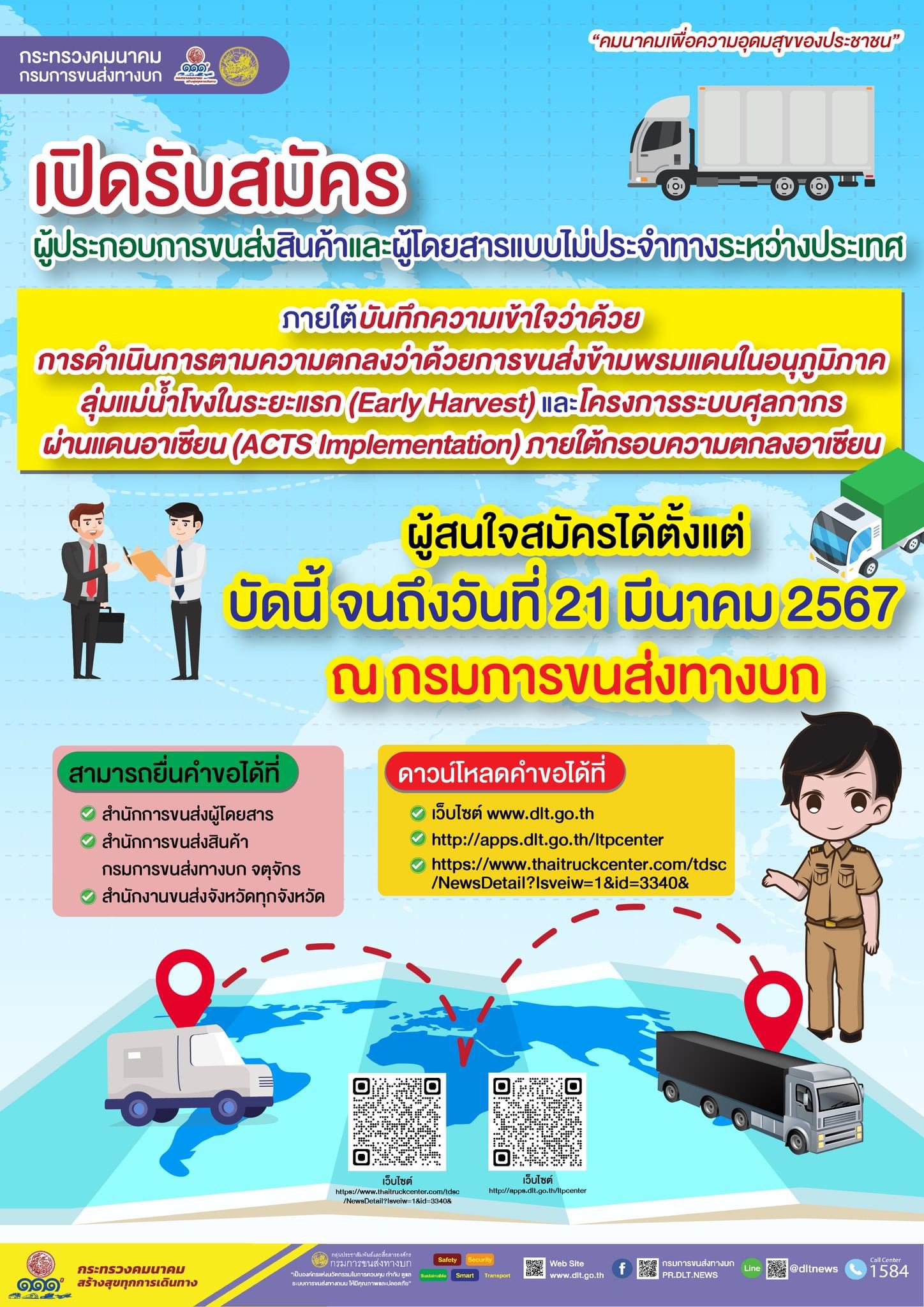 ทั้งนี้ ผู้สนใจสามารถยื่นคำขอรับการคัดเลือกเป็นผู้ประกอบการขนส่งสินค้าและผู้โดยสารระหว่างประเทศภายใต้ความตกลง GMS CBTA และ AFAFGIT ได้ที่สำนักการขนส่งผู้โดยสาร สำนักการขนส่งสินค้า กรมการขนส่งทางบก หรือที่สำนักงานขนส่งจังหวัดที่ผู้ขอมีภูมิลำเนาอยู่ ตั้งแต่บัดนี้จนถึงวันที่ 21 มีนาคม 2567