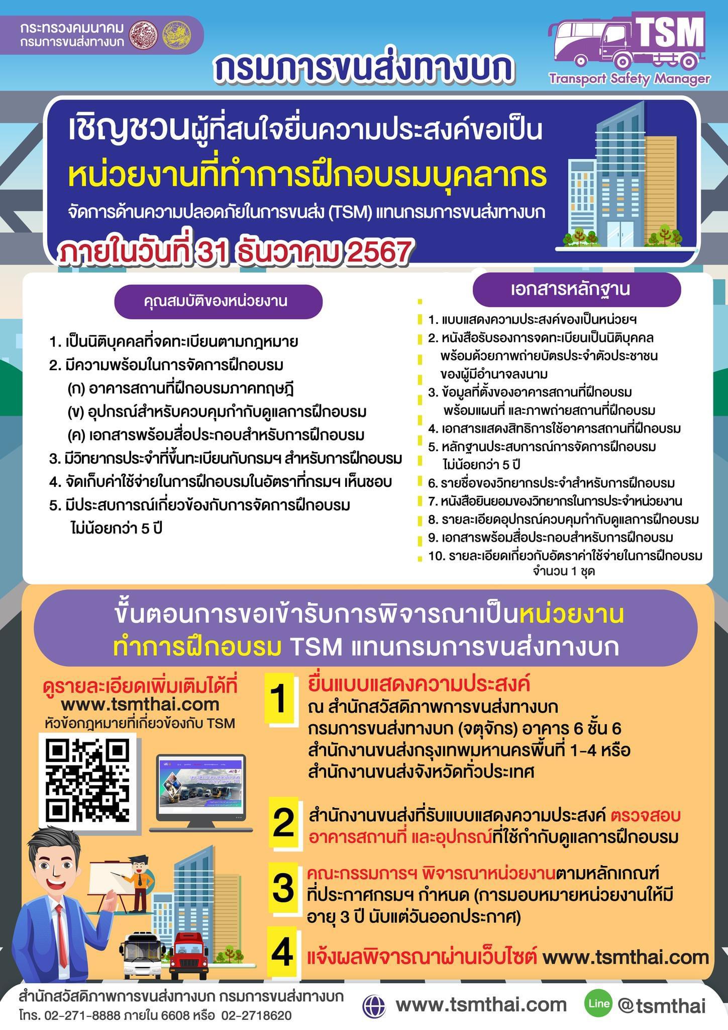 ในปัจจุบันกรมการขนส่งทางบกออกประกาศมอบหมายหน่วยงานทำการฝึกอบรมแทนกรมฯ รวม 35 แห่ง และมีวิทยากรที่ขึ้นทะเบียนแล้ว 295 คน เพื่อให้มีหน่วยงานในการฝึกอบรมบุคลากรจัดการด้านความปลอดภัยในการขนส่งเพียงพอสามารถรองรับการจัดให้มีบุคลากรจัดการด้านความปลอดภัยในการขนส่งได้อย่างเหมาะสม กรมการขนส่งทางบก ขอเชิญชวนผู้สนใจยื่นความประสงค์ขอเป็นหน่วยงานทำการฝึกอบรมแทนกรมฯ และวิทยากรในการฝึกอบรมบุคลากรจัดการด้านความปลอดภัยในการขนส่ง (TSM) โดยสามารถยื่นคำขอได้ที่กรมการขนส่งทางบก สำนักงานขนส่งกรุงเทพมหานครพื้นที่ 1-4 และสำนักงานขนส่งทั่วประเทศ ตั้งแต่บัดนี้จนถึง 31 ธ.ค. 67 โดยจะต้องมีคุณสมบัติ เป็นนิติบุคคลที่จดทะเบียนตามกฎหมาย มีความพร้อมในการจัดการฝึกอบรม เช่น อาคารสถานที่ อุปกรณ์ เอกสารประกอบการอบรม มีวิทยากรที่ขึ้นทะเบียนกับกรมฯ และมีประสบการณ์เกี่ยวข้องกับการจัดการฝึกอบรมไม่น้อยกว่า 5 ปี ทั้งนี้ต้องจัดเก็บค่าใช้จ่ายการฝึกอบรมตามอัตราที่กรมฯ กำหนด