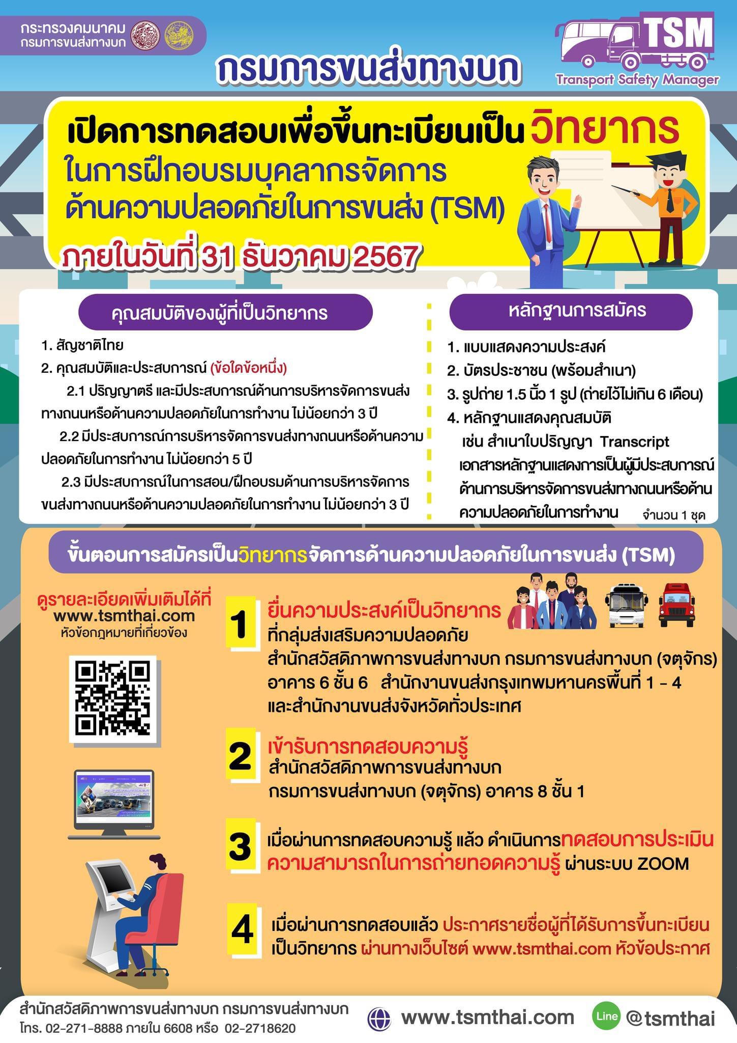 รองอธิบดีกรมการขนส่งทางบก เปิดเผยว่า กรมฯ ยังเปิดการทดสอบเพื่อขึ้นทะเบียนเป็นวิทยากรในการฝึกอบรมบุคลากรจัดการด้านความปลอดภัยในการขนส่ง (TSM) โดยคุณสมบัติของผู้ที่เป็นวิทยากร ต้องมีสัญชาติไทย จบการศึกษาระดับปริญญาตรีและมีประสบการณ์ด้านการบริหารจัดการด้านการขนส่งทางถนนหรือด้านความปลอดภัยในการทำงาน ไม่น้อยกว่า 3 ปี หรือ มีประสบการณ์ด้านการบริหารจัดการด้านการขนส่งทางถนนหรือด้านความปลอดภัยในการทำงาน ไม่น้อยกว่า 5 ปี หรือ มีประสบการณ์ ในการสอนฝึกอบรมด้านการบริหารจัดการขนส่งทางถนนหรือด้านความปลอดภัยในการทำงาน ไม่น้อยกว่า 3 ปี โดยผู้สนใจยื่นความประสงค์ขอเป็นหน่วยงานที่ทำการฝึกอบรมและวิทยากรในการฝึกอบรมบุคลากรจัดการด้านความปลอดภัยในการขนส่ง (TSM) สามารถเตรียมเอกสารหลักฐานการสมัคร