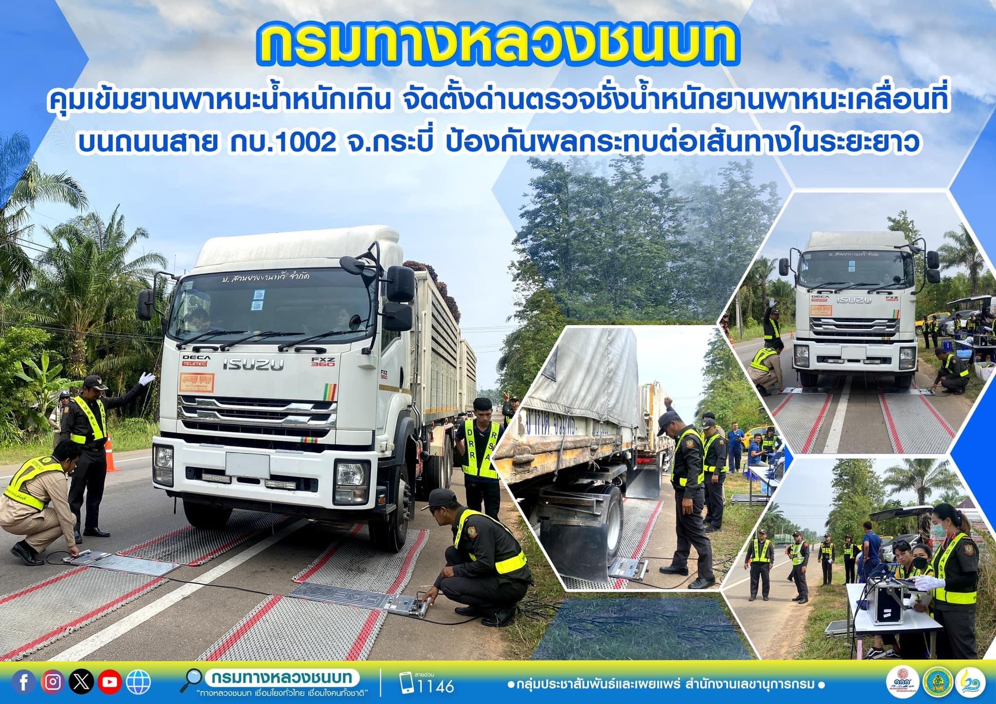 กรมทางหลวงชนบท (ทช.) โดยสำนักงานทางหลวงชนบทที่ 14 (กระบี่) แขวงทางหลวงชนบทกระบี่ ร่วมกับสำนักงานขนส่งจังหวัดกระบี่ และตำรวจภูธรอ่าวลึก จัดตั้งด่านตรวจชั่งน้ำหนักแบบเคลื่อนที่บนถนนทางหลวงชนบทสาย กบ.1002 แยก ทล.4 - บ้านบางทราย อำเภออ่าวลึก จังหวัดกระบี่ บริเวณ กม.ที่ 10+200 ถึง 10+300 ซึ่งผลการตรวจสอบปรากฎว่าผ่านเกณฑ์มาตรฐานทุกคัน โดยตรวจสอบและควบคุมน้ำหนักของรถบรรทุกไม่ให้น้ำหนักเกินกว่าที่กฎหมายกำหนด ป้องกันการชำรุดของพื้นผิวถนนในระยะยาว เพื่อให้ประชาชนเดินทางบนถนนทางหลวงชนบทได้อย่างสะดวกปลอดภัย