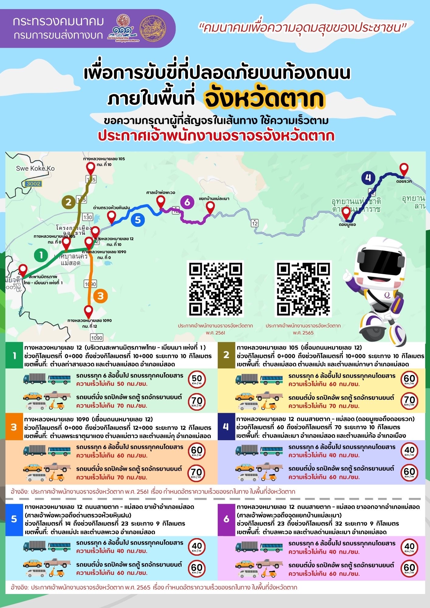กรมการขนส่งทางบกแจ้งประชาสัมพันธ์ ให้ผู้ประกอบการขนส่งและผู้ที่สัญจรในเส้นทางในพื้นที่จังหวัดตาก กำหนดควบคุมความเร็ว รถบรรทุกตั้งแต่ 6 ล้อขึ้นไป , รถยนต์นั่ง, รถปิคอัพ ,รถตู้ ,และ รถจักรยานยนต์ จำนวน 6 เส้นทาง เพื่อป้องกันและลดความเสี่ยงต่อการเกิดอุบัติเหตุทางถนนในพื้นที่จังหวัดตากโดยรายละเอียดดังนี้