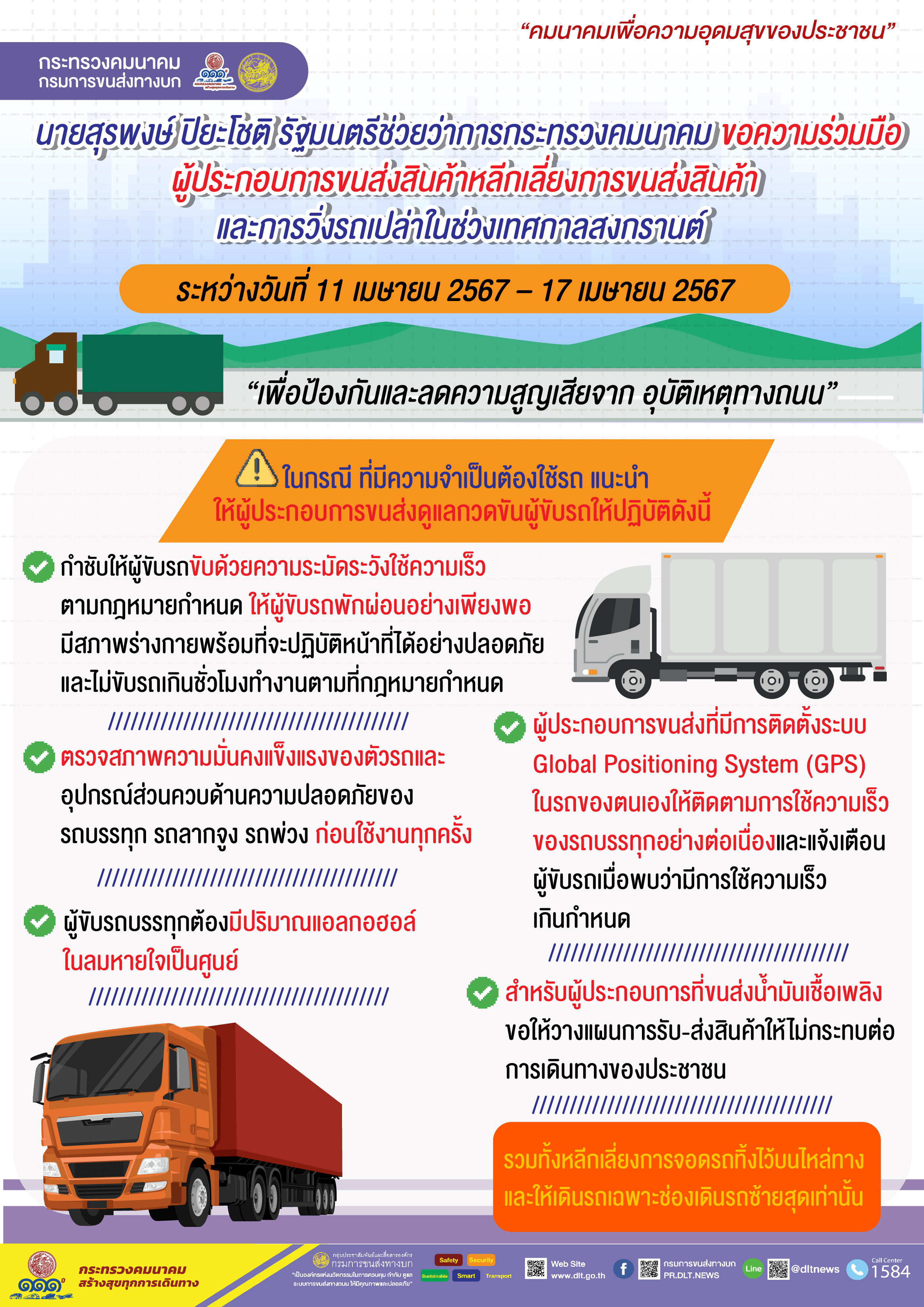 4.ผู้ประกอบการขนส่งที่มีการติดตั้งระบบGlobalPositioning System(GPS)ในรถของตนเองให้ติดตามการใช้ความเร็วของรถบรรทุกอย่างต่อเนื่องและแจ้งเตือนผู้ขับรถเมื่อพบว่ามีการใช้ความเร็วเกินกำหนด5.สำหรับผู้ประกอบการที่ขนส่งน้ำมันเชื้อเพลิงขอให้วางแผนการรับ-ส่งสินค้าให้ไม่กระทบต่อการเดินทางของประชาชนรวมทั้งหลีกเลี่ยงการจอดรถทิ้งไว้บนไหล่ทางและให้เดินรถเฉพาะช่องเดินรถซ้ายสุดเท่านั้น