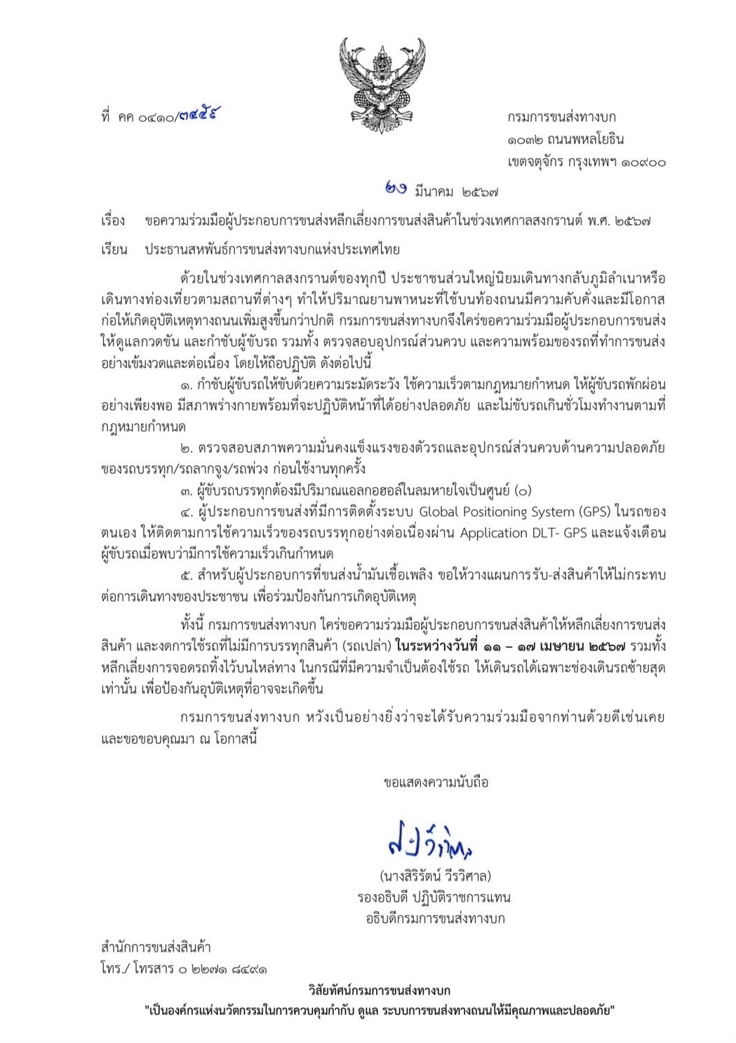 สหพันธ์การขนส่งฯ และกรมการขนส่งฯ ขอความร่วมมือผู้ประกอบการขนส่งด้วยรถบรรทุกไม่ประจำทาง รถบรรทุกส่วนบุคคล ร่วมเป็นส่วนหนึ่งในการป้องกันและลดอุบัติเหตุทางถนนและส่งมอบถนนที่ปลอดภัยให้แก่ผู้ใช้รถใช้ถนนในช่วงวันหยุดเทศกาลสงกรานต์นี้