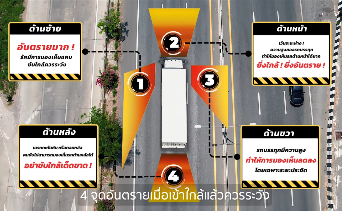 กรมการขนส่งทางบก และ สหพันธ์การขนส่งทางบกแห่งประเทศไทย(LTFT) ร่วมรณรงค์ขับขี่ให้ปลอดภัยเพื่อลดโอกาสในการเกิดอุบัติเหตุ เพิ่มความปลอดภัยให้ตัวคุณ และผู้ร่วมใช้รถใช้ถนนลดพฤติกรรมเสี่ยง หลีกเลี่ยงการเข้าไปอยู่ใกล้พื้นที่ จุดบอดรถบรรทุก ในทุกกรณี เพื่อการ ขับขี่ปลอดภัยเพื่อลดโอกาสในการเกิดอุบัติเหตุ เพิ่มความปลอดภัยให้ตัวคุณ และผู้ร่วมใช้รถใช้ถนน